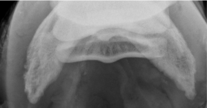 To give an example; a 10-year-old Warmblood gelding presented with bilateral (both) forelimb lameness that blocked to the heel region. Radiographs of the front feet show that the external hoof balance is good but based on the radiographs some minor modifications were needed. There was minor sclerosis of the distal border of the navicular bone. In addition to the shoeing recommendations, the horse was given a single injection into the coffin joint since medications delivered here also diffuse into the navicular region. A short course of oral firocoxib (Equioxx) was prescribed for 14 days. Since on the radiographs the horse had some bone remodeling, we followed up with Osphos every 6 months to reduce bone resorption and modeling over the long term.